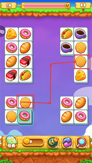 2、关卡中点击相同的【华夫饼】类物品,通过连线消除积累进度,优先清理密集区域的同类型目标。