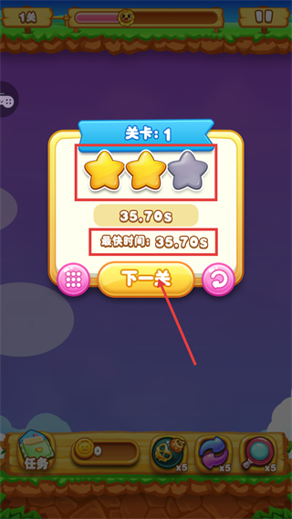 4、通关后查看【35.70s】的最快时间记录,点击【下一关】继续挑战,提升消除效率以获取更高星级。