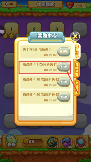 1、在【奖励中心】查看任务进度,如“通过关卡3次”当前进度2/3,完成后可领取100金币,优先推进新关卡任务获取奖励。