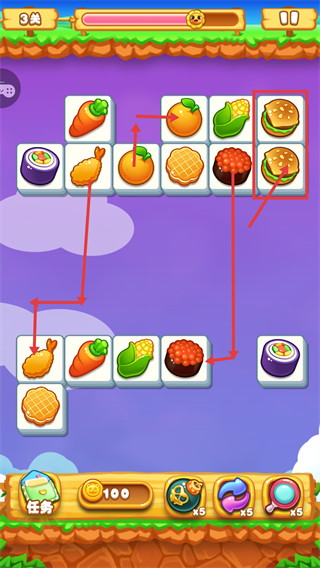 2、关卡中优先匹配相同的【汉堡】等物品,同时关注物品分布,通过连线消除积累进度,提升消除效率。