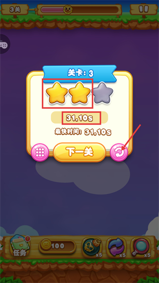 4、通关后获取【2星】评价及【31.10s】最快时间记录,若需提升星级可点击【重玩】按钮优化消除节奏,或选择【下一关】继续挑战。