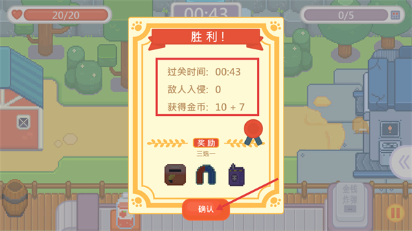 4、胜利后会显示【过关时间-00:43】等数据,获得【金币-10+7】,点击【确认】后可选择三选一奖励。