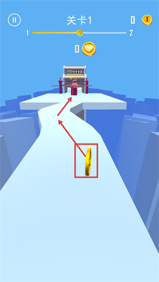 2、在【关卡1】中,沿路径收集路面的【金币】,注意避开地形缝隙,向终点的装置推进。