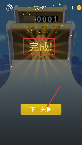4、出现【完成!】提示后,代表关卡通关,点击【下一关】按钮可进入后续关卡积累更多金币。