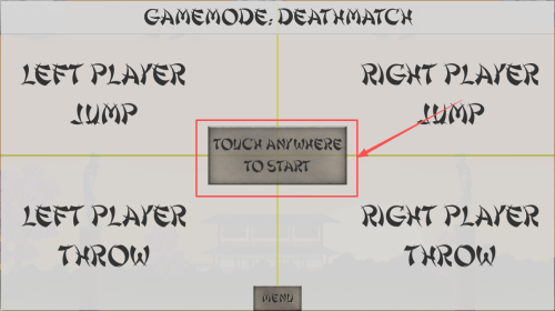 3、了解控制方式:在游戏控制说明界面,了解左右玩家的跳跃和投掷操作,点击“TOUCH ANYWHERE TO START”开始游戏。