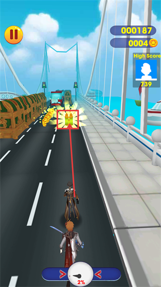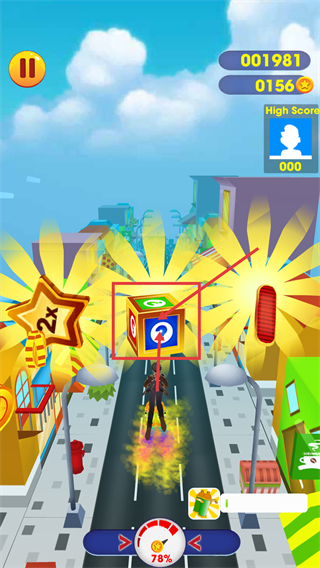 2、跑酷途中遇到道路中的道具时,优先拾取以获得增益效果,同时留意上方【000187】得分的实时增长。
