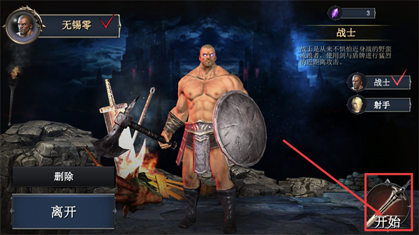 1、选择【战士】职业后,点击【开始】进入游戏,该职业擅长近战,使用剑与盾牌进行猛烈攻击,适合近距离作战。