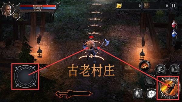 2、进入【古老村庄】场景后,可通过左侧轮盘控制移动,右侧技能按钮释放招式,先熟悉操作方式再推进探索。