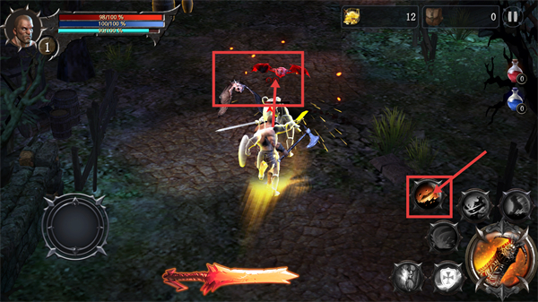 3、遭遇蝙蝠类敌人时,点击右侧技能按钮释放攻击,击败敌人可获得金币奖励,同时留意自身血量变化。