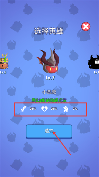 1、选择【Lv.7-小恶魔】英雄,其提供【21%-攻击力】【21%-生命值】等加成,点击【选择】即可将其加入对战。