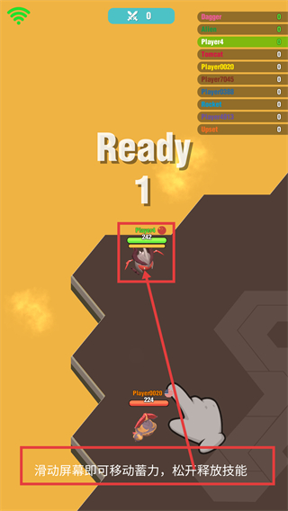 2、对战中通过滑动屏幕蓄力,松开释放技能,可攻击敌方单位(如Player0020),借此降低敌方血量并提升自身排名。