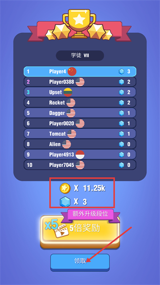 4、对战获胜后段位升至【学徒-VII】,可领取【11.25k-金币】与【3-钻石】奖励,点击【领取】快速获取资源。