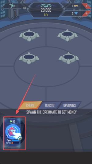 3、开始赚钱:连续点击生成船员,金币从20,000升至20,177,每秒收益提升至1/s。