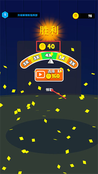 4、胜利后点击【领取】获取【40】金币奖励,也可选择加倍选项获得更多资源。