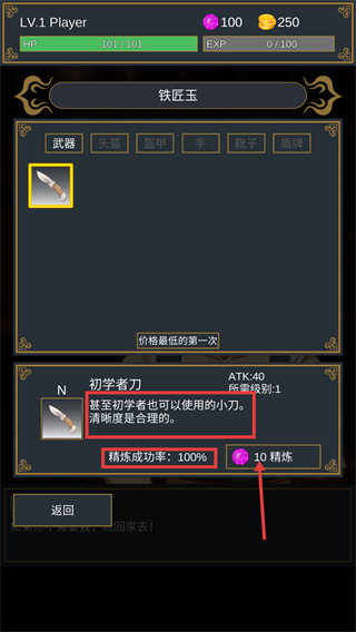 1、在【铁匠玉】界面选择【初学者刀】,消耗【10】宝石进行精炼,其【100%】成功率可稳定提升战力。