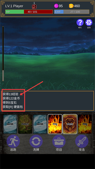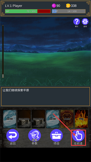 2、探索平原时点击【往前走】按钮推进流程,同时搭配手牌中的属性卡牌应对随机遭遇。