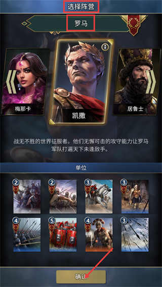 1、在【选择阵营】界面选【罗马】,其单位攻防能力突出,点击【确认】完成阵营配置。