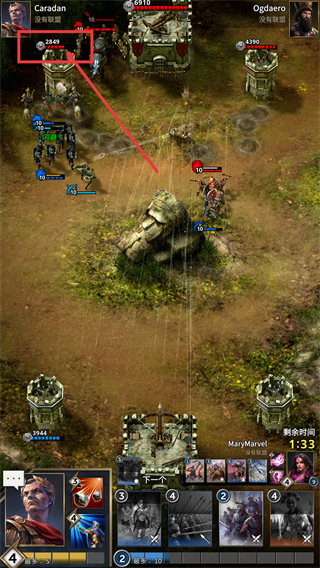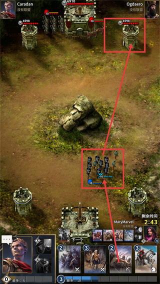 3、战斗中操控我方单位(标识【10】),优先攻击敌方建筑(如标注的防御塔)以削弱防线。
