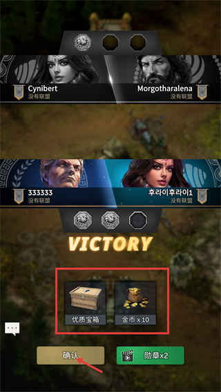 4、胜利后领取【优质宝箱】与【金币x10】奖励,点击【确认】完成结算并继续挑战。