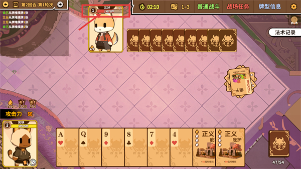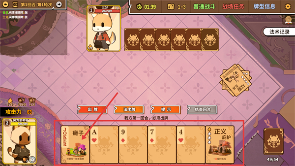 1、首回合选【癞子】牌(可替普通牌),搭配手牌出牌,同时用【正义庇护】加防御,保证首回合必出牌。