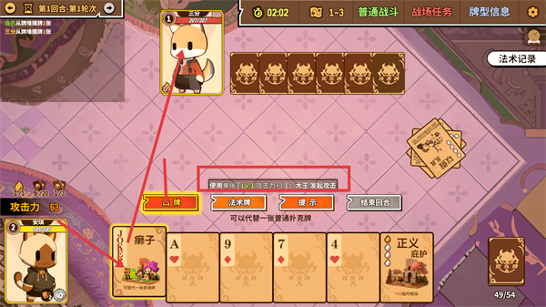 2、选【癞子】后点【出牌】,以【大王】发起攻击,触发【Lv.1攻击力+1】效果,压制敌方血量。