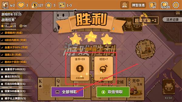 4、胜利后点【全部领取】,获取【金币+59】和【经验+7】,这些资源可用于角色养成与后续对局。