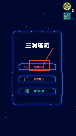 1、在主界面点击【开始游戏】进入关卡,该玩法融合三消与塔防机制,需通过合成防御塔抵御敌人。