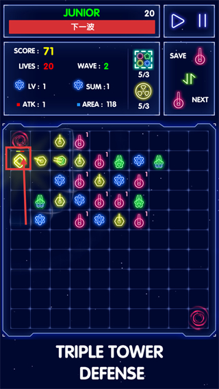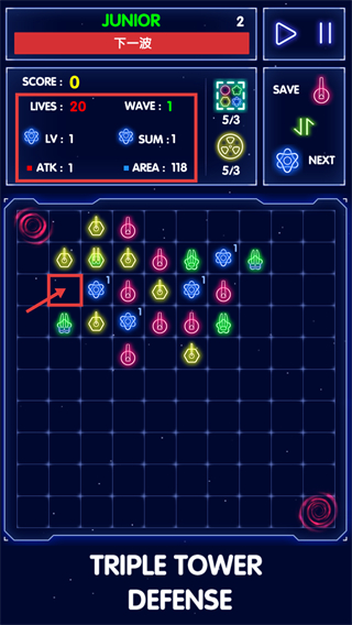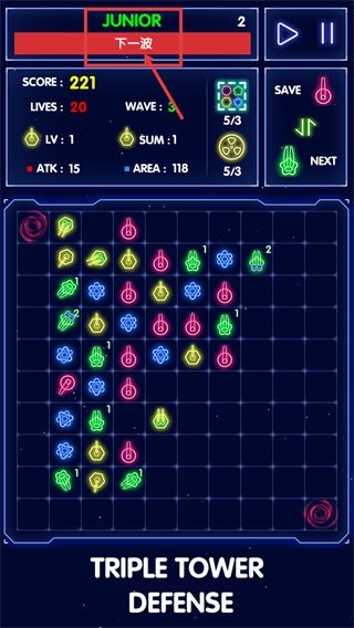 4、完成当前波次后点击【下一波】推进关卡,通过持续合成高级塔(如【LV:1】的黄色塔)积累分数,挑战更高波次。