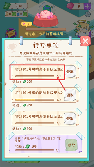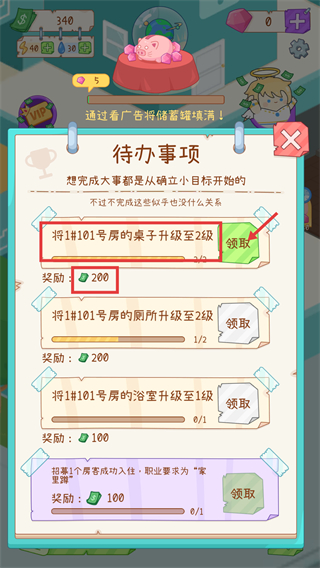 2、查看【待办事项】中的任务,比如【将1#101号房的桌子升级至2级】,完成后可领取对应的【200】奖励。