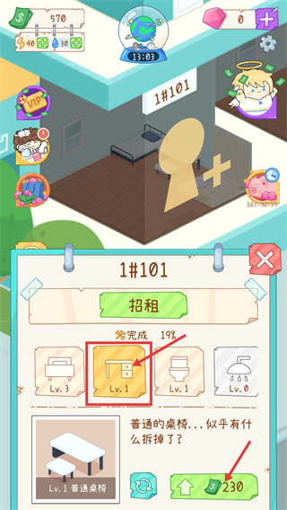 3、在【1#101】房间界面,找到【Lv.1-普通桌椅】,消耗【230】货币点击升级按钮,推进房间设施升级进度。
