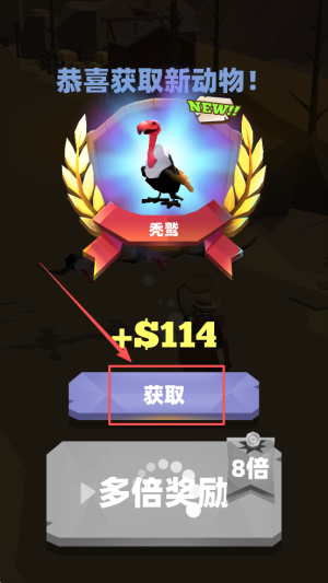 4、领取奖励:出现“恭喜获取新动物!秃鹫+\$114”时,点击“获取”领取8倍奖励。