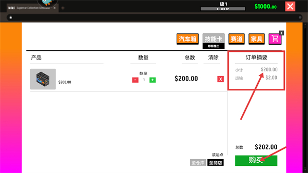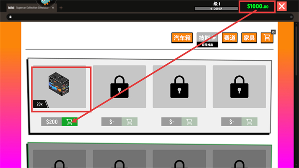 3、在商品界面选择【20x-汽车箱】,消耗【$200】进行购买,此操作是推进订单流程的基础步骤。