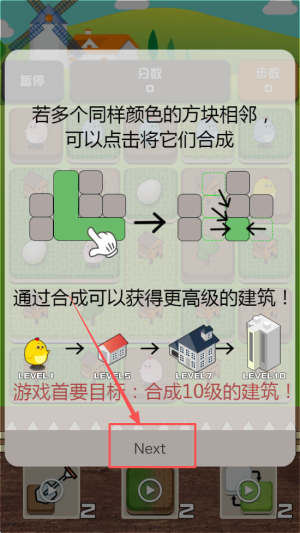 2、选择关卡:点击“Next”进入第一关,了解合成10级建筑的目标。