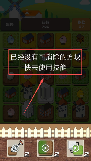 4、使用技能:当提示“已经没有可消除的方块”时,点击技能继续挑战。
