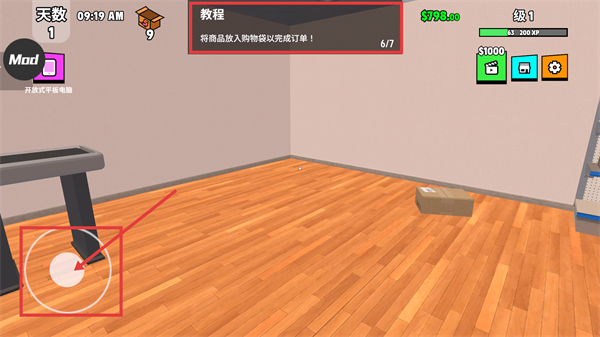 1、在【教程-6/7】阶段,点击地面的操作按钮,将商品放入购物袋,这是完成订单的前置步骤。
