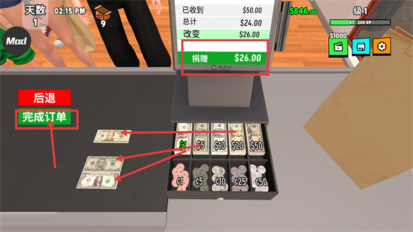 4、收到顾客支付的【$50.00】后,计算出【改变:$26.00】,可选择【捐赠】或找零,再点击【完成订单】收尾。