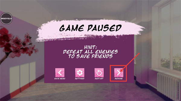 4、暂停界面中,遵循【HINT:-DEFEAT-ALL-ENEMIES-TO-SAVE-FRIENDS】提示,点击【RESUME】继续游戏。