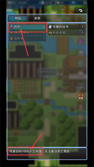 4、物品栏中的【药剂】可恢复目标【1000点生命值】,需注意无法复活死亡角色,战斗前合理使用提升续航。
