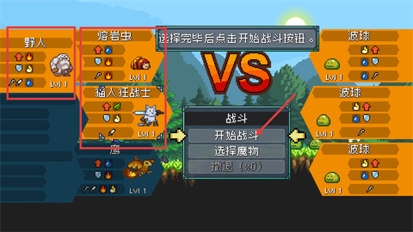 1、选择【野人】【熔岩虫】等Lv1魔物后,点击【开始战斗】按钮触发对战,利用低等级魔物积累战斗经验。