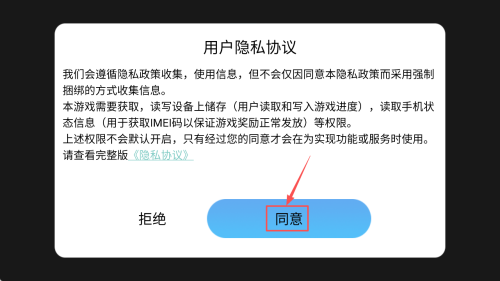 1、同意隐私协议:启动游戏后,阅读并同意用户隐私协议,点击“同意”以继续。