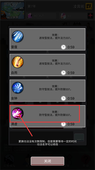 2、选择【清虚】技能,其为防守型技法,可提升防御-337,更换功法需等待对应冷却时间。