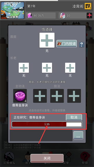 3、在悟道峰界面中,【正在研究-傲骨金身诀】需等待1:35完成研究,首座长老可加速该进程。