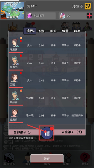 1、点击弟子界面的【招】按钮可招募新弟子,同时关注弟子的境界与状态,合理分配修行资源。