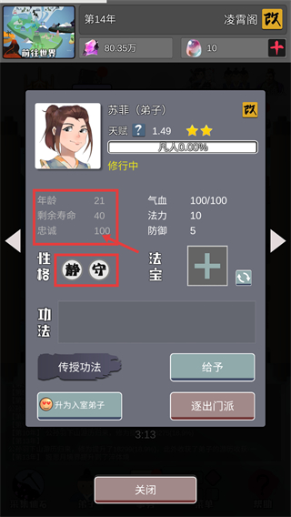 2、查看弟子【苏菲】的属性面板,其【静-守】性格适配防御类培养,可优先提升忠诚度至100。