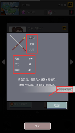 3、给弟子配备【灵剑-法宝-凡品】,可提升气血-446、法力-99、防御-49,同时能提高弟子忠诚。