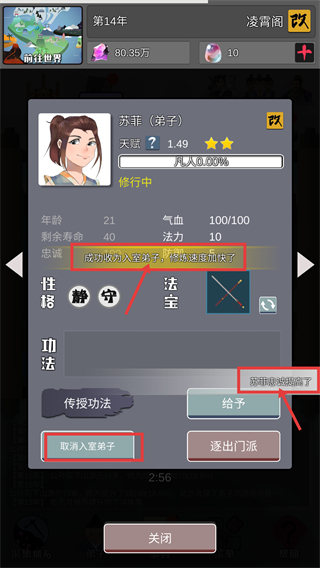 4、将弟子升为【入室弟子】可加快修炼速度,若需调整可点击【取消入室弟子】进行变更。
