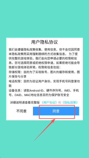 1、进入游戏:首先打开游戏主界面,阅读用户隐私协议后点击“同意”继续进入关卡。