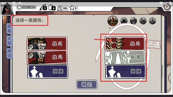 2、面对【选择一条路线】界面时,可根据需求选【战斗】【奇遇】【删牌】类选项,选后点【确定】推进。