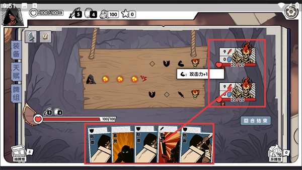 3、战斗时利用手牌区的【防御】【重击】等卡牌行动,注意敌人【20/20】的血量,触发【攻击力+1】增益可提升输出效率。