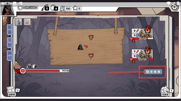 4、手牌操作完毕后点击【回合结束】进入敌方回合,需关注自身血量变化,后续可调整卡牌策略优化战斗节奏。